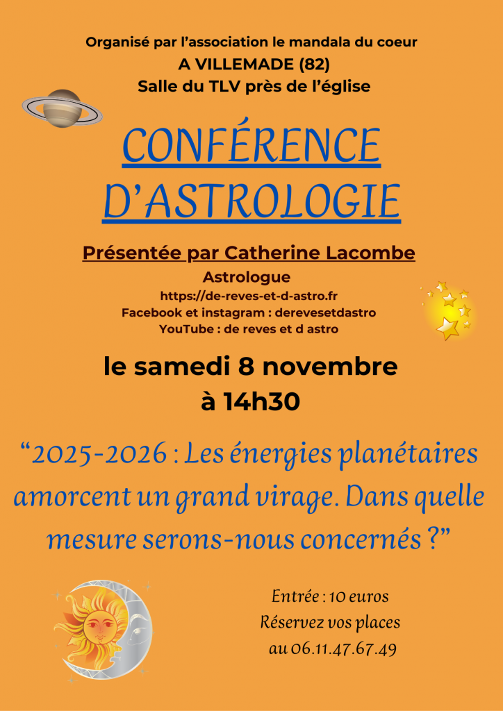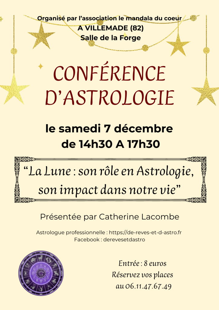 Sur demande, je me déplace pour faire une ou des conférences sur l’Astrologie, dont le sujet peut être défini ensemble.