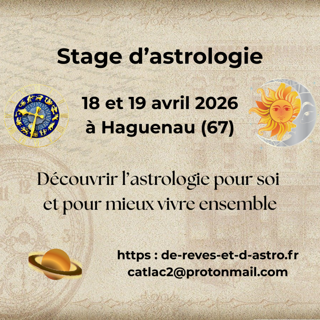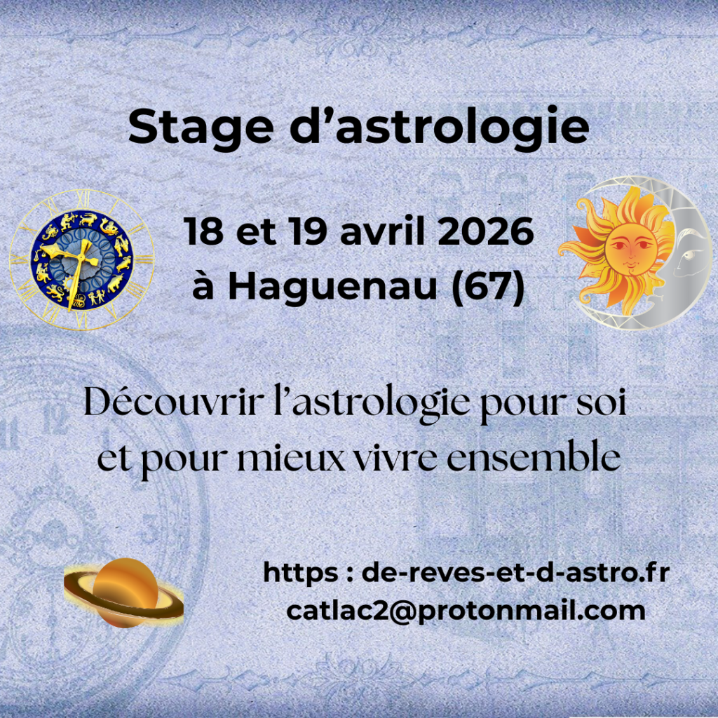 Si vous, et des personnes autour de vous, êtes intéressé(e)s pour participer à un stage d’astrologie et que vous pouvez proposer une salle pour se retrouver, nous pouvons mettre en place un stage. Je pourrais me déplacer dans votre région pour venir l’animer. Pour cela, je demande qu’il y ait 6 participants maximum.